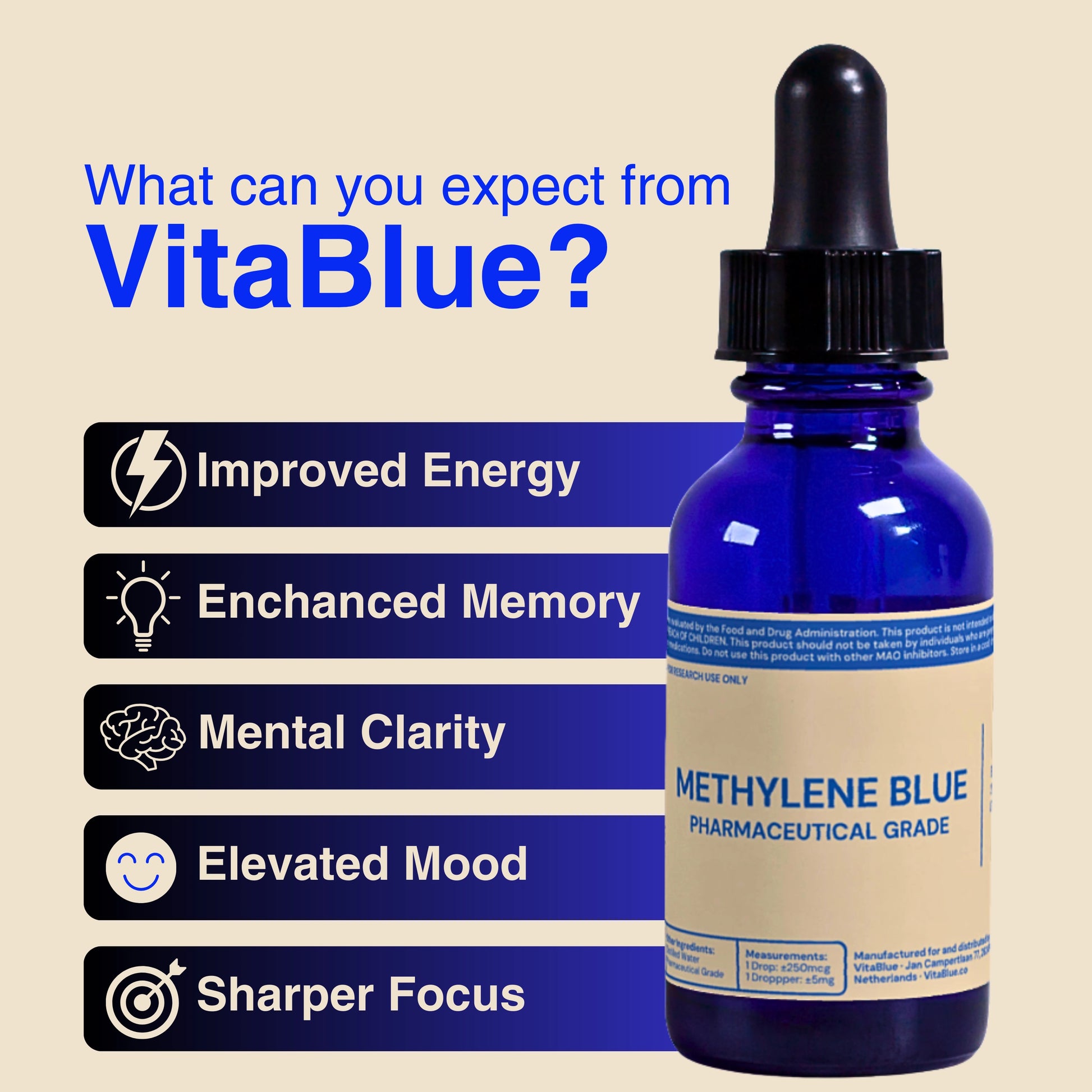 General Information : Methylene Blue may support cellular energy production and brain health. However, effects can vary based on physiology, body weight, sensitivity, and concurrent supplement or medication use.